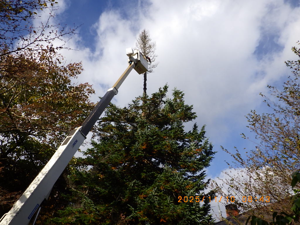 11/10北杜市武川町の西部にある山あいの別荘地で梢端部(先端)が枯れてしまったモミの木の枯れた部分を除去しました。