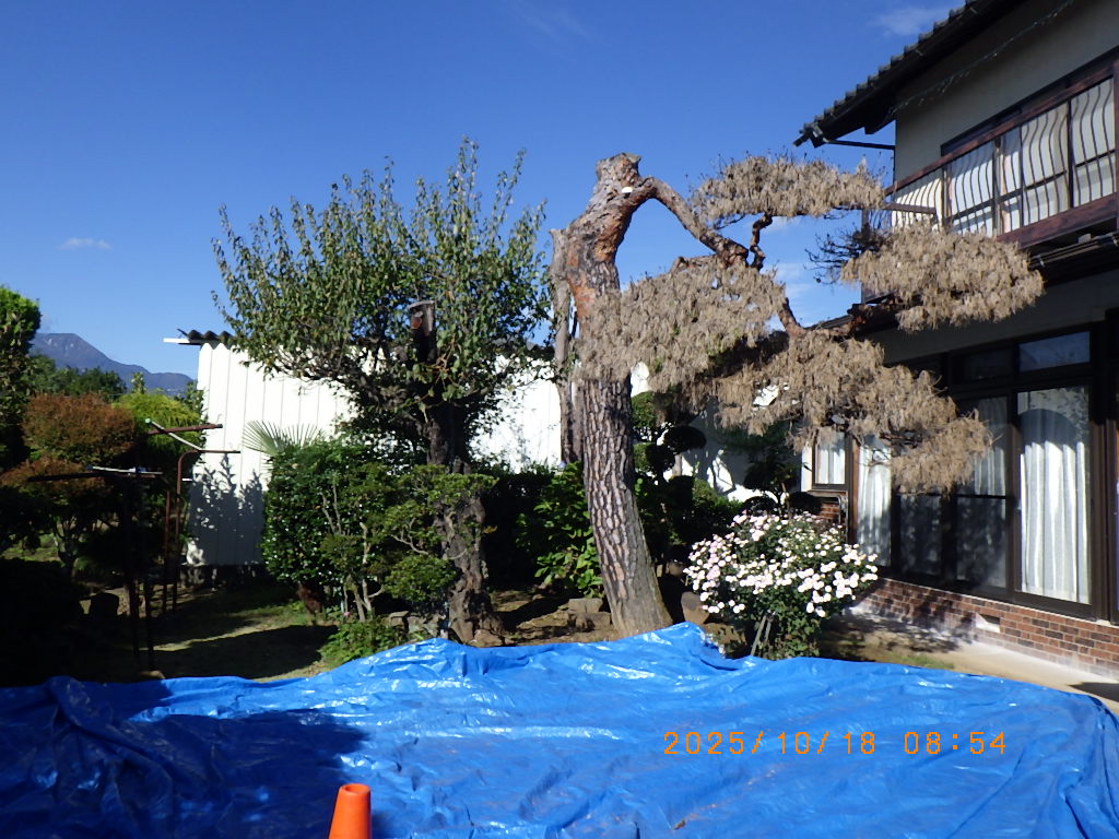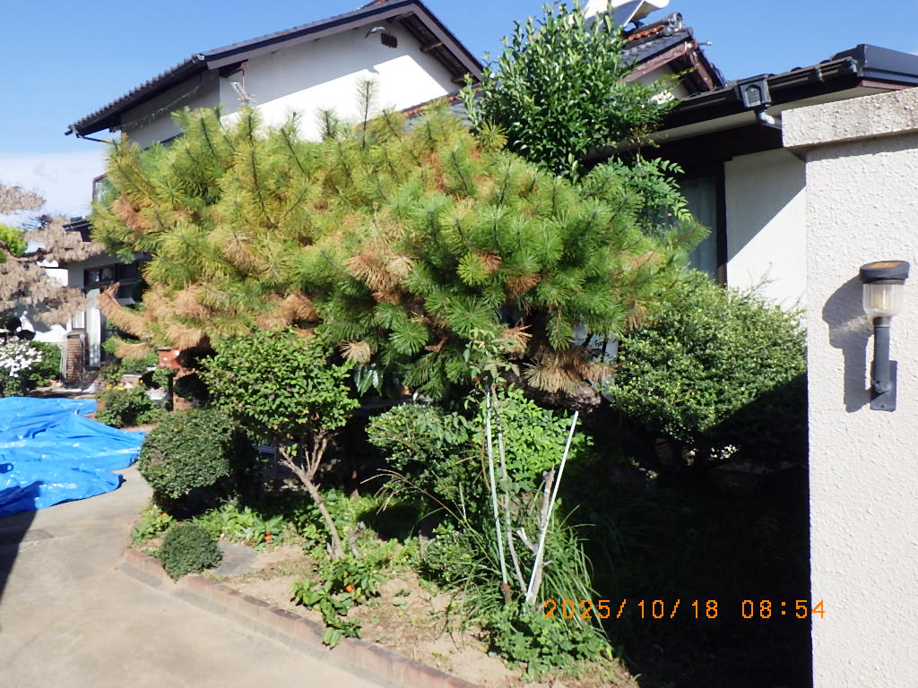 玄関前に植えられていたアカマツです。他の植木との密度が高くなり、さらにマツクイムシと思われる葉枯れが始まっていました。